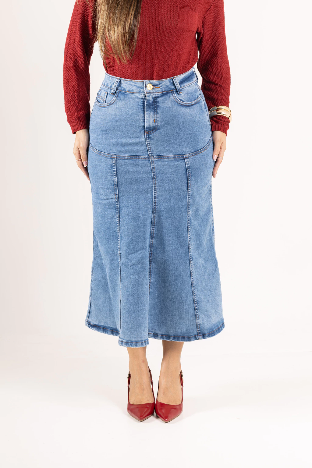 A Saia Jeans Longuete (Ref. 1207) é uma peça sofisticada, confeccionada em um jeans mais encorpado, que garante durabilidade e conforto. O tecido possui uma leve elasticidade, proporcionada pela presença de elastano em sua composição, oferecendo um ajuste perfeito ao corpo e um caimento impecável.
